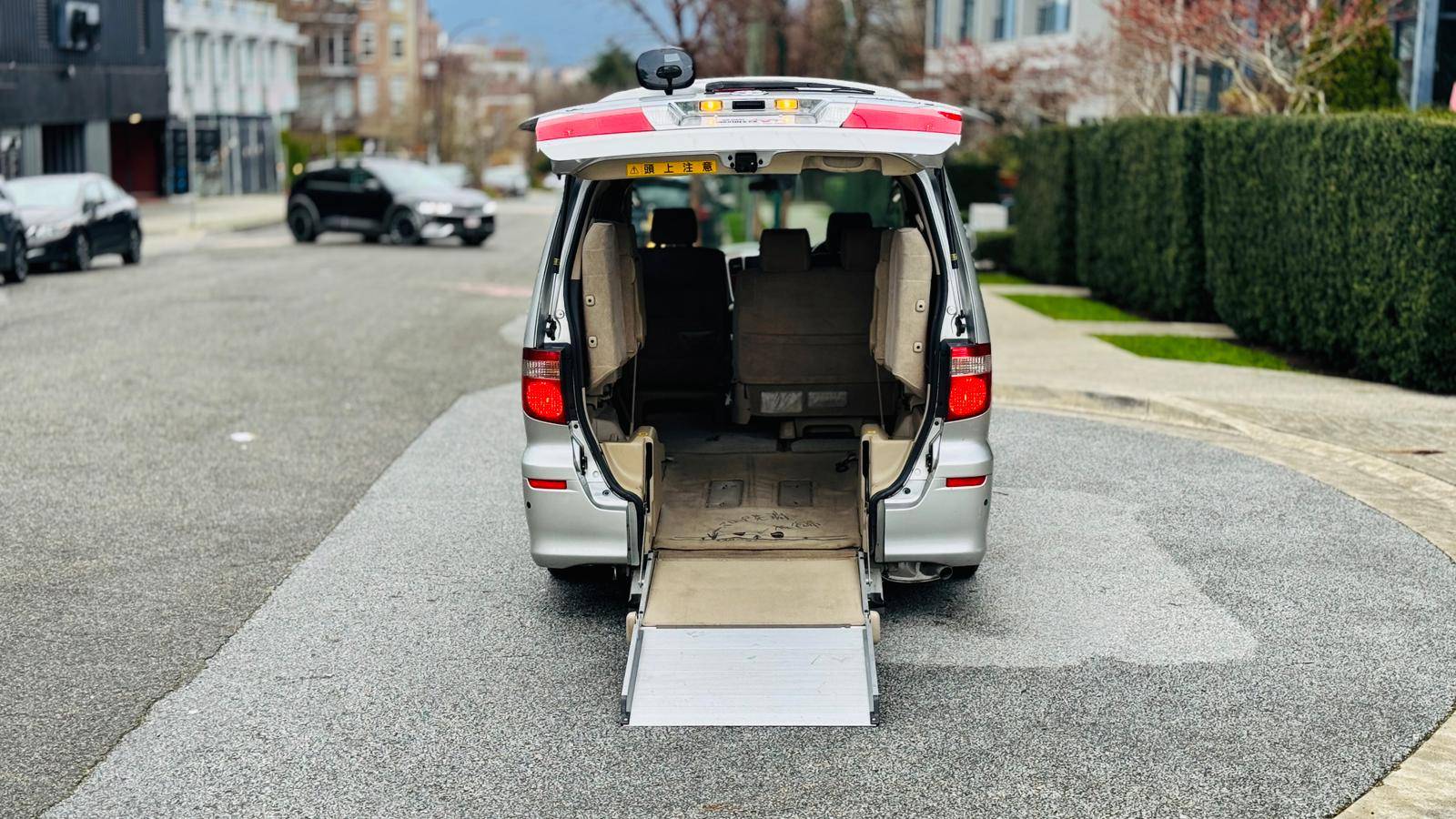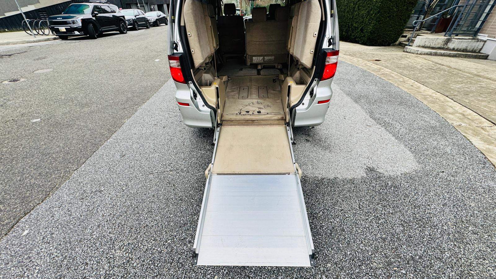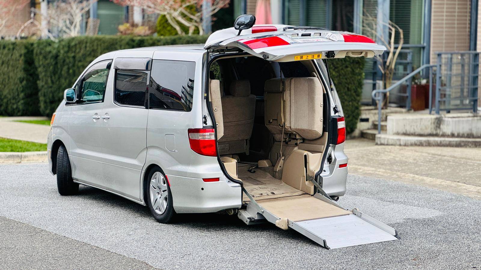 2004 Toyota Alphard 3L V6 Wheelchair accessible vehicle with only 106k km! Loading and unloading the wheelchair can be done with the push of a button. If you are not transporting a wheelchair, it can be used as a normal minivan with up to 7 people including the driver. It is spacious, suitable for a family. The timing belt has already been changed on this vehicle, so it’s ready to go! This right-hand drive vehicle imported from Japan. It has been fully inspected and registered for use in British Columbia. no extra steps just need insurance to get on the road. Come take it for a spin